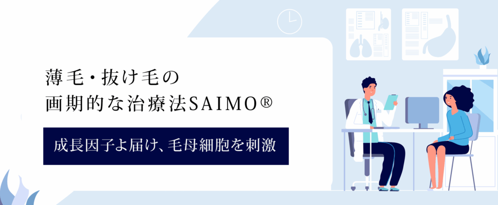 SAIMO®は、発毛に有効な成長因子を真皮層まで深く浸透させ、毛を生み出す細胞である毛母細胞を刺激することで発毛を促す治療法です。毛母細胞の細胞分裂が活性化することで乱れたヘアサイクルが整い、ハリとコシのある髪の毛を発毛させることができます。