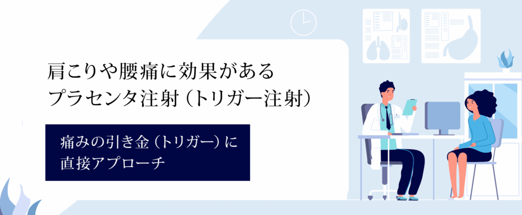 従来、肩こりや腰痛の治療にはステロイド薬のトリガー注射も行なわれてきましたが、今回、当クリニックでは、プラセンタのトリガー注射も選択肢の一つとして採用し、受診者様の特質に合わせて選択することが可能となりました。