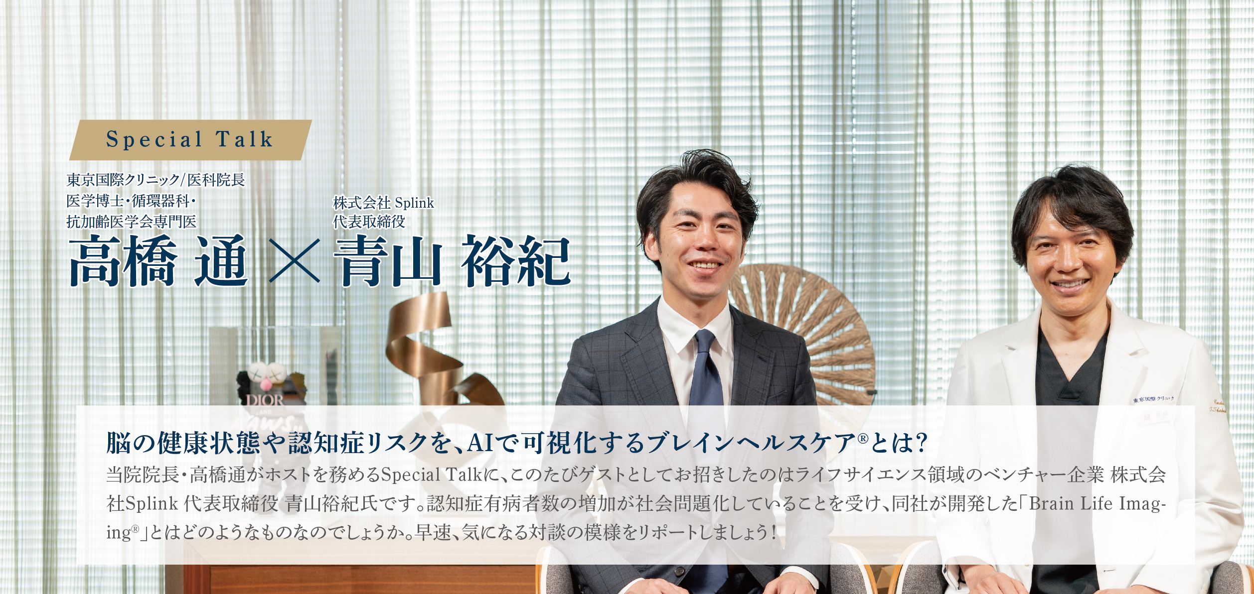 当院院長・高橋通がホストを務めるSpecial Talkに、このたびゲストとしてお招きしたのはライフサイエンス領域のベンチャー企業 株式会社Splink 代表取締役 青山裕紀氏です。認知症有病者数の増加が社会問題化していることを受け、同社が開発した「Brain Life Imaging®」とはどのようなものなのでしょうか。