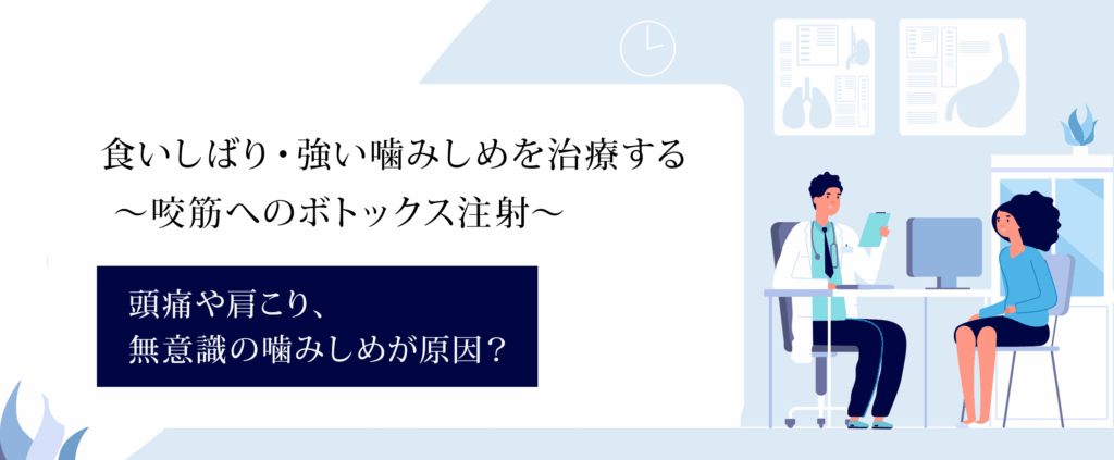 「噛む」という行為は、毎日食事の度に必要な動きです。咬筋などの筋肉に過剰な負担がかかっていると、首や肩などの筋肉にも炎症が起きやすくなり、頭痛や肩こりなど、さらに生じる痛みや違和感が別のストレスを生むこともあります。こうした自覚症状のある方はもちろん、睡眠時にご家族から歯ぎしりや食いしばりがあると言われている方、エラが硬く肥大していると感じる方、口を大きく開けづらい方などは、ぜひ当クリニックにご相談ください。