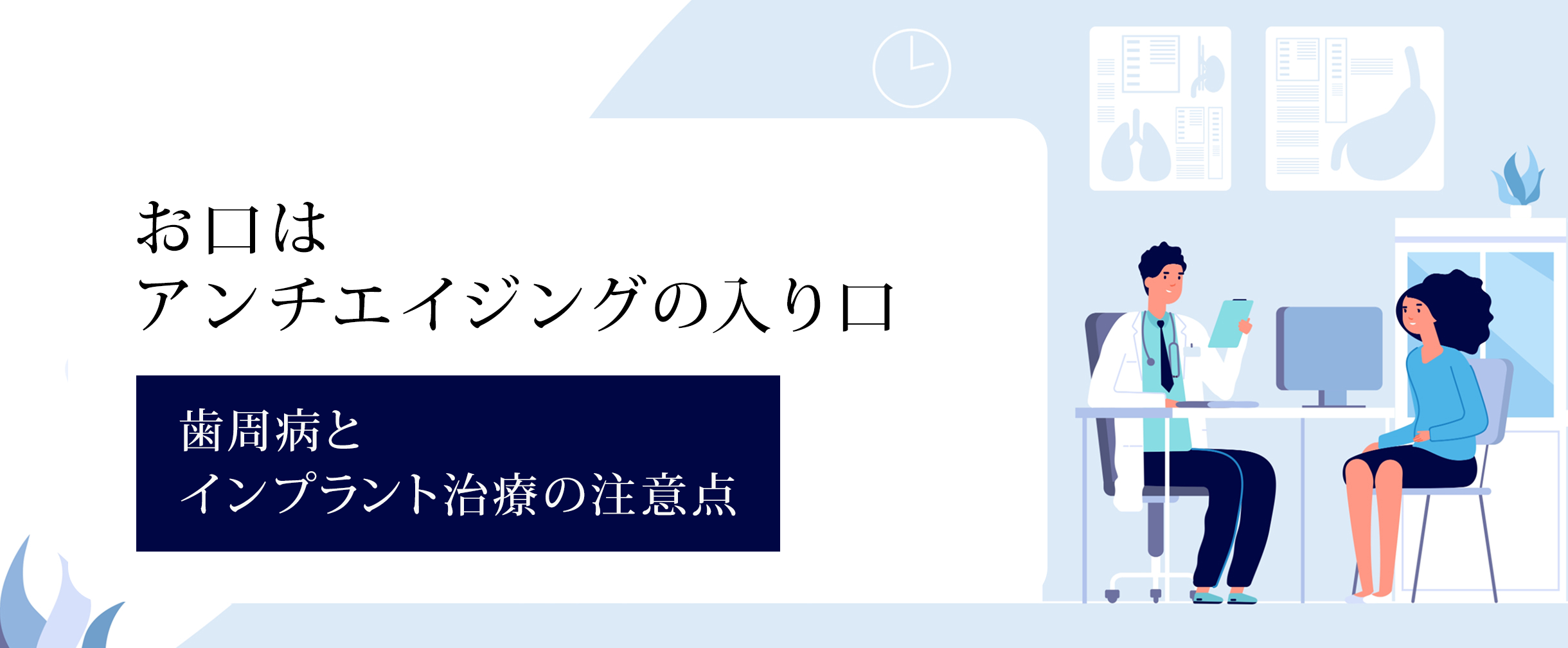 東京国際クリニック/歯科には、歯周病で悩まれている方が多く来院されます。日本人が歯を失う最大の原因は「歯周病」です。昔は歯を失った場合、歯を補う治療法は入れ歯しかありませんでしたが、今はインプラントという選択肢があります。インプラント治療とは、失った歯の代わりにチタン製の人工歯根(インプラント)を埋入し、歯本来の機能や見た目を取り戻す治療です。インプラントは自分の歯に近い感覚で噛めますし、見た目も天然歯(自分の歯)と変わらないなどメリットの多い優れた治療ですが「万能」というわけではありません。当然、天然歯のほうが優れています。ご自身の歯を1本でも多く残すためには、歯茎が歯周病に侵されないよう定期的に歯周病専門医に診てもらうこと、万が一歯周病にかかっていたならば、まずは歯周病を治すことが最も重要です。インプラント治療においても同じです。歯を残せる可能性があるにもかかわらず「歯周病は治らない」と診断され、歯科医院でインプラントを選択されたり、歯周病が治っていない状態でインプラント治療をするのは非常に大きなリスクを伴います。